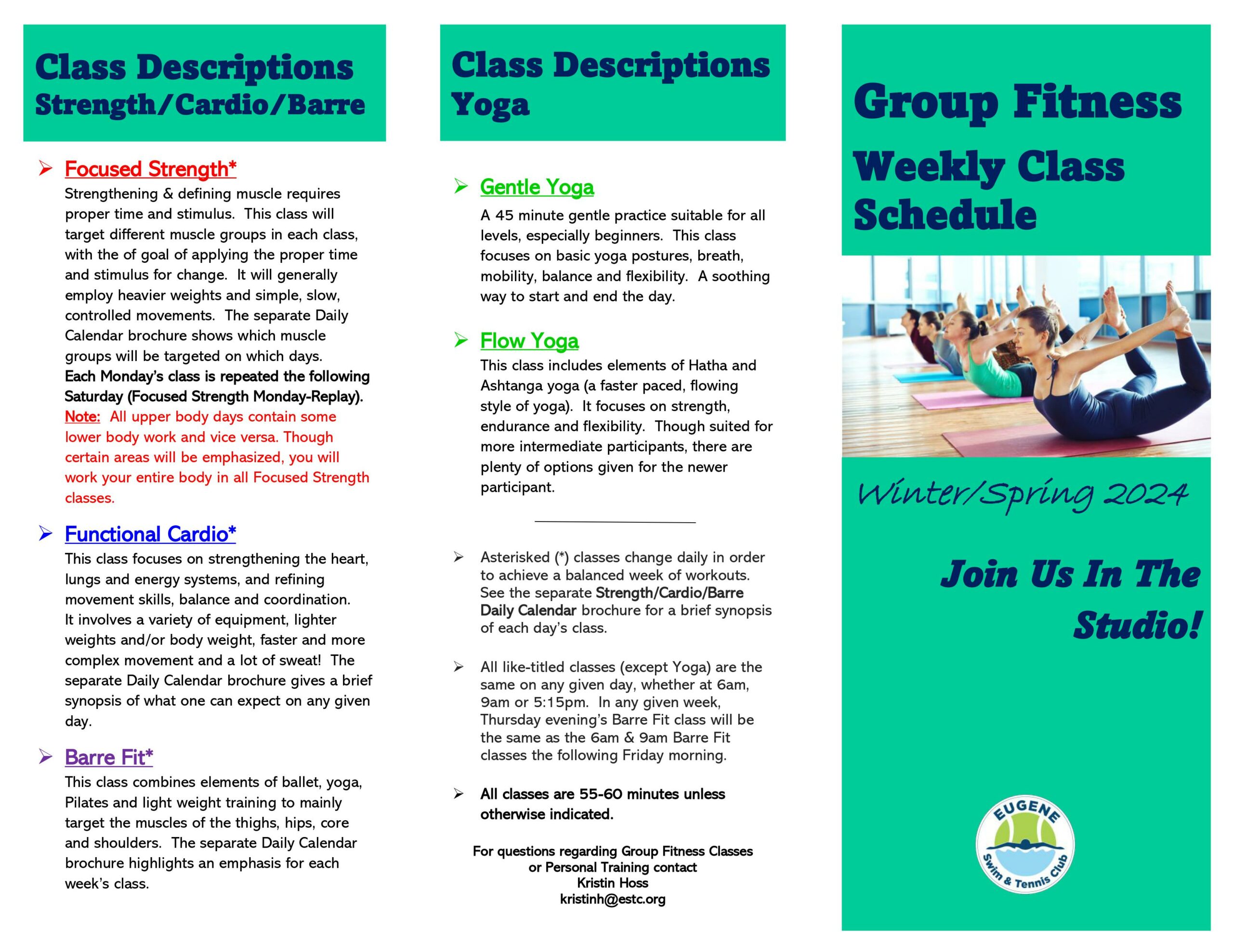 Fitness Schedule ESTC invites you to join our classes now with LIVE instruction and also, world-class virtual instruction in our group fitness studio. Classes all day! Invite a few friends of family members to join you in your workout or meet new workout friends.
